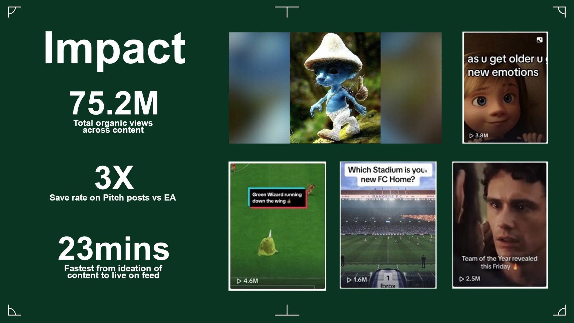 Whatever’s hot on social. For EA, we react to the biggest social trends and create short form video content that gives EA FC a credible connection point with culture, beyond the game.